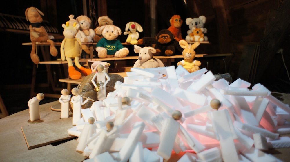 Dans On était une fois une douzaine de peluches assises sur une partie du gradin, fait face aux spectateurs “réels”. Entre ces deux publics face-à-face, un spectacle de On est attendu et aura lieu… peut-être.