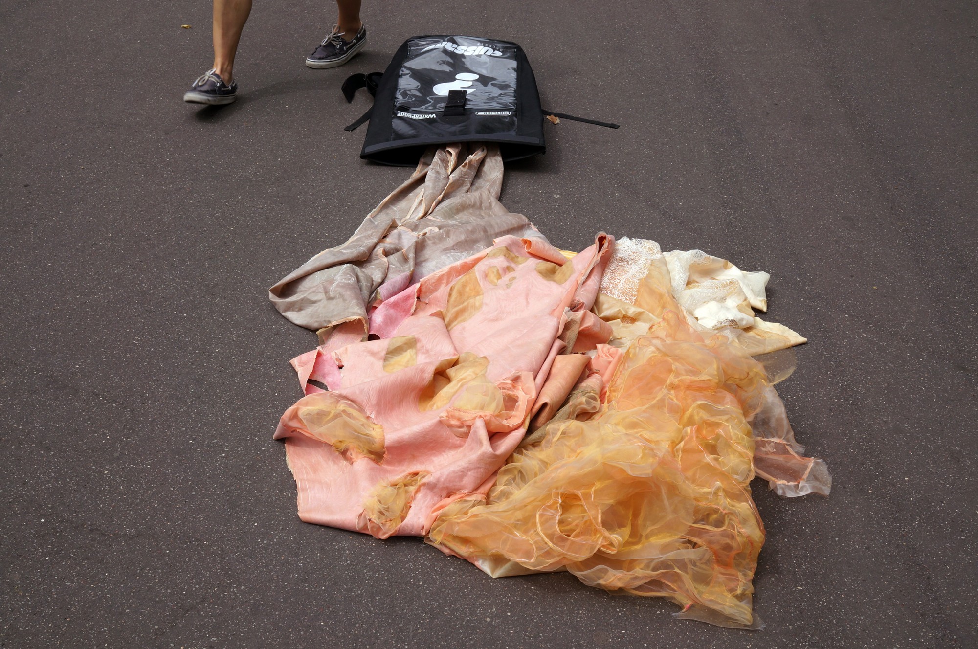 Stéphanie Cazaentre a créé une sculpture inédite et protéiforme en tissu et latex de quinze mètres de long qui absorbe son environnement. Rappelant les ouvrages des femmes devant leur tapisserie, on peut y lire les histoires et les émotions vécues à travers la multitude de détails brodés. Trous, bulles percées, viscosité, mousses, aplat et amas fibreux se révèlent selon les contextes alors qu’Alice Martins, coursière-galeriste, déballe et remballe l’œuvre, la glisse et se transforme avec. Dans le cadre de la Galerie Cuissard, une galerie d’art embarquée dans le sac à dos d’une coursière à vélo.