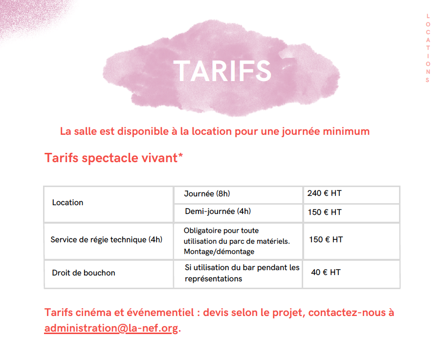 Située à Pantin, aux portes de Paris et à proximité du métro, La Nef propose à la location ses différents espaces pour des spectacles, des répétitions, des tournages et prises de vue. Pas de location possible pour les particuliers ou les événements privés.