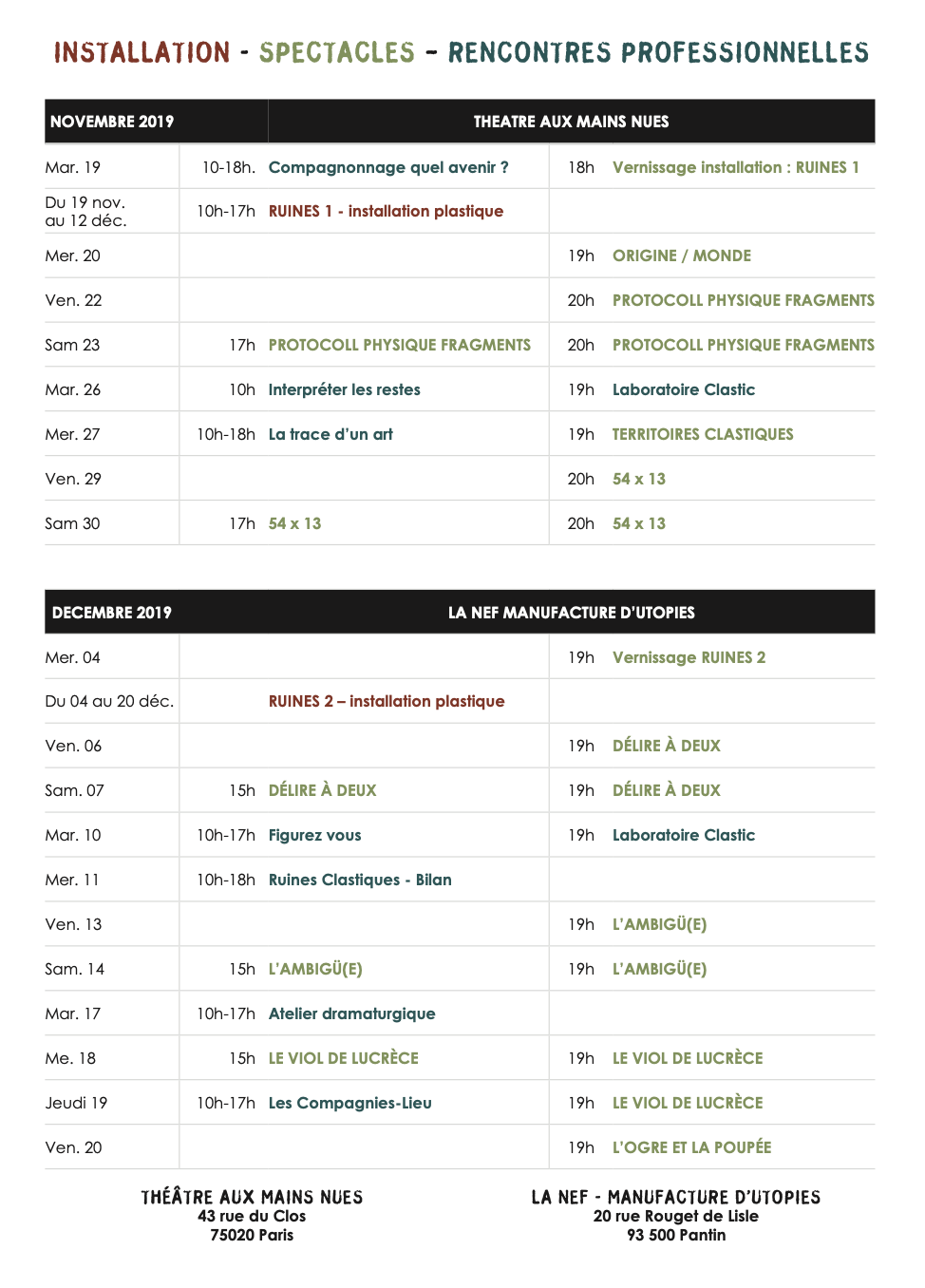 Mardi 26 novembre - au Théâtre aux mains nues, Mardi 10 décembre - à la NEF manufacture d’Utopies,