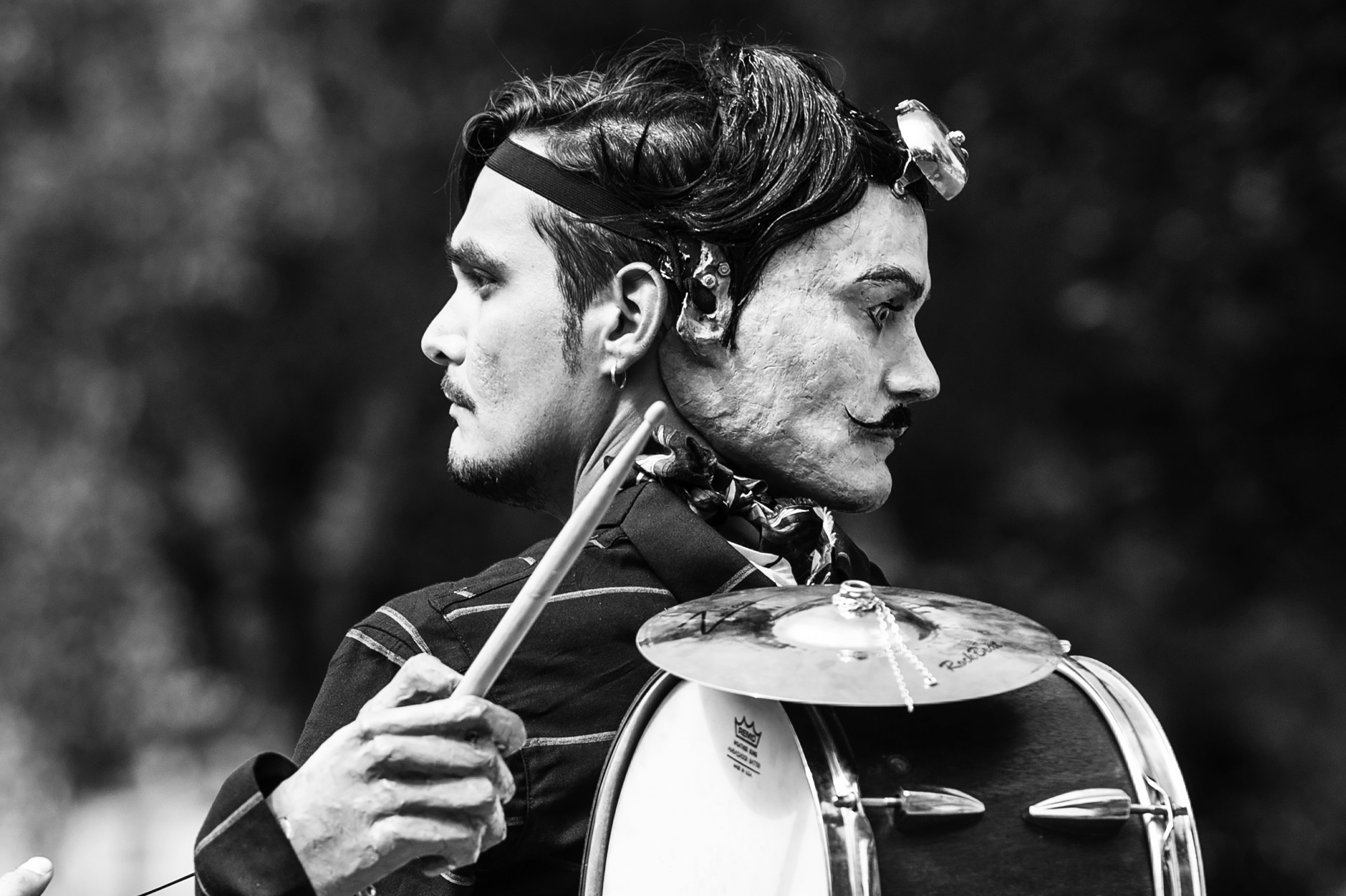 Deux musiciens sont assis dos à dos : l’un est vrai et l’autre faux. D’un côté, un musicien et son instrument à cordes, le Ronroco. De l’autre, un percussionniste flanqué d’un tambour, d’une cymbale et de cuillères musicales aux genoux. L’un des deux est un faussaire, un faux air de l’autre…