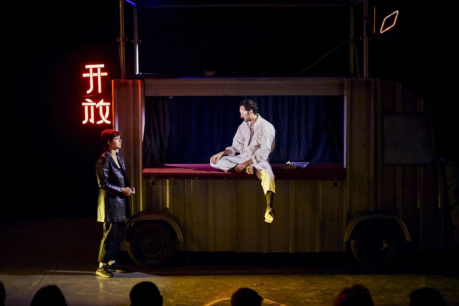 Le spectacle est une enquête, un retour sur les événements, pas seulement pour les raconter mais démêler le vrai du faux, s’emparer des assignations et se les réapproprier, et trouver de la réparation par le théâtre. Pour ce faire, il faut inventer comment. Chaque acte est une rumeur, et chaque facette de l’assignation demande une théâtralité propre : qu’est-ce que ça me fait de remettre en jeu la manipulation de mon double-enfant ? Comment mon faciès me hante, me suit, me soutient, m’épaule ? Puis-je l’apprivoiser ? Les figures qui ont mis des mots sur mon identité, quelles parts de moi sont-elles devenues ? Que faire d’elles, sinon les déposer sur scène ? La fiction, sous forme d’une épopée, nous lance, aux comédiens, aux créateurs techniques et à moi-même, des défis à résoudre sur scène. Nous imaginons, ensemble, une infinités de moyens pour trouver les gestes justes ; nos corps et nos mots, nos ombres, des masques réalistes, irréalistes, des marionnettes de toutes sortes, un camion truqué qui se déploie en boite à image, immeuble, forêt, ce qu’on veut, grâce aux lumières, aux sons, au projections, grâce aux outils du théâtre, car cette pièce est une lettre d’amour au théâtre et à la transcendance qu’il nous offre.